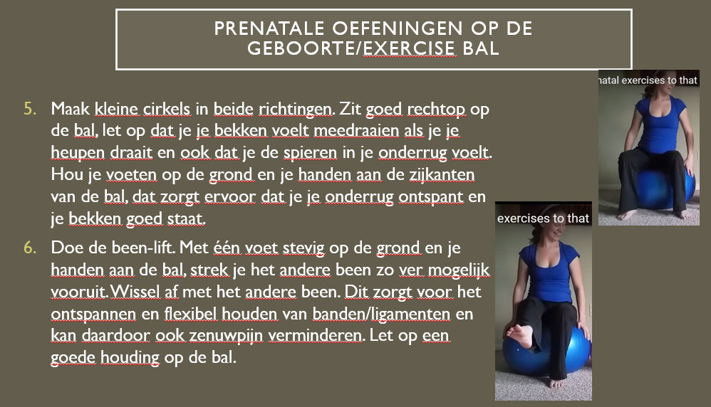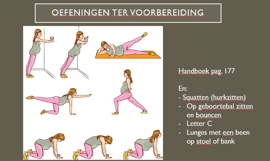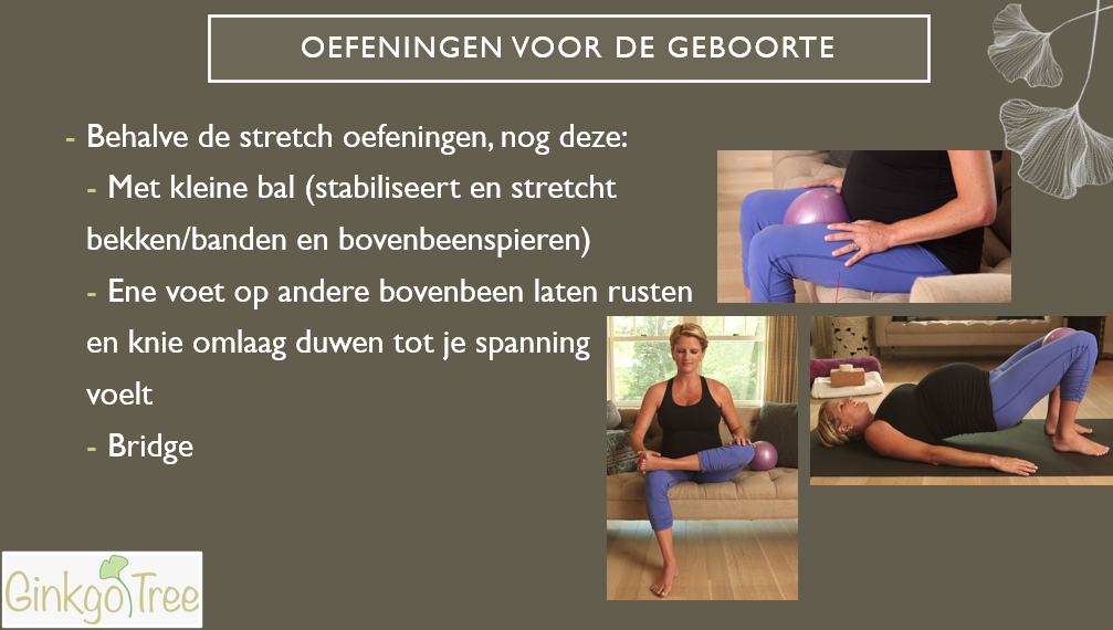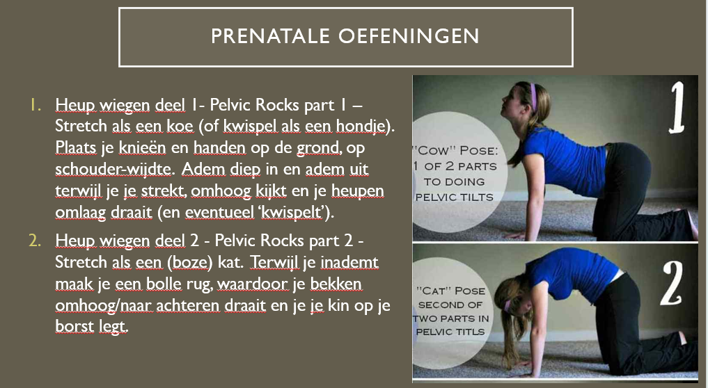 Doe de oefeningen op de plaatjes regelmatig. Zo blijft je bekken in beweging en kan het kindje goed indalen.