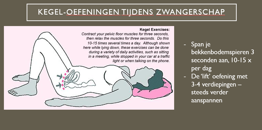 - Span de bekkenbodemspieren aan en hou dit 3 seconden vast, doe dit 10-15 keer per dag (bv 2 x 5-8 keer)