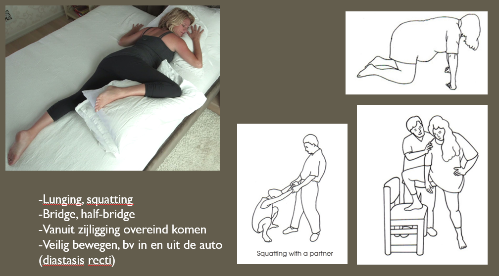In/uit bed stappen en in/uit de auto stappen vraagt wat extra aandacht. Als je vanuit rugligging recht overeind komt, of vanuit de auto in één keer 1 been uit de auto zet, opstaat en andere been mee laat komen, geeft dit extra veel druk op de buik, probeer dat te voorkomen! Door de groei van de buik, rekt het bindweefsel uit en kan het gebeuren dat de rechte buikspieren uit elkaar gaan wijken en er een bult/kegel/bobbel zichtbaar wordt op je buik. Dit heet diastase recti en komt vrij veel voor. Meestal herstelt dit na de bevalling weer, doordat de spieren weer naar elkaar toe bewegen, maar dit kan wel 6-9 maanden duren. Als het blijft, is het goed om (bekken)fysio in te schakelen.