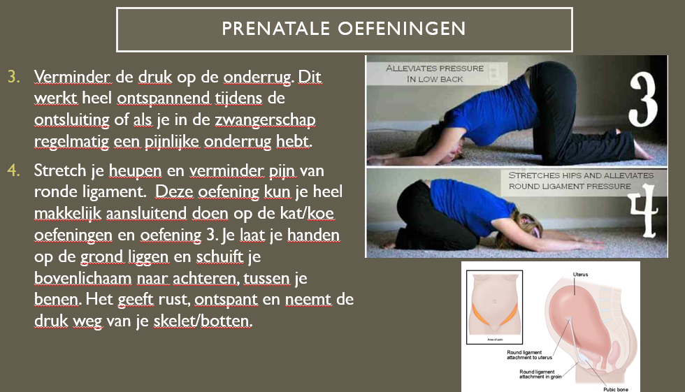 Bridge: ga op de grond liggen met de knieën opgetrokken, voeten op de grond. Til je heupen/billen omhoog tot er een rechte lijn is van schouders naar knieën. Laat rustig zakken en herhaal. Als dit te zwaar is door je zware buik, niet meer doen!